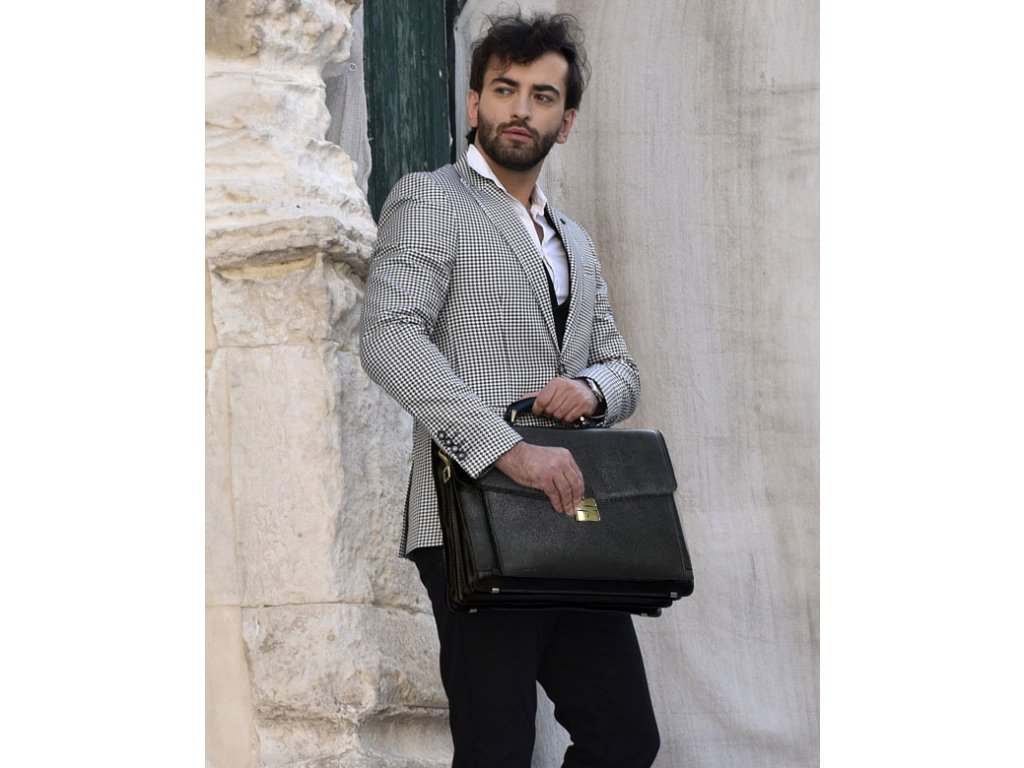 Italská aktovka z pravé kůže, ručně šitá LOTUS; černá