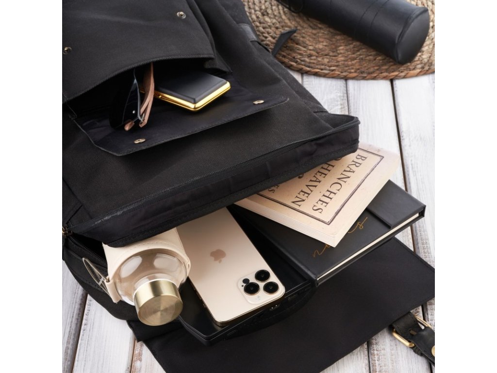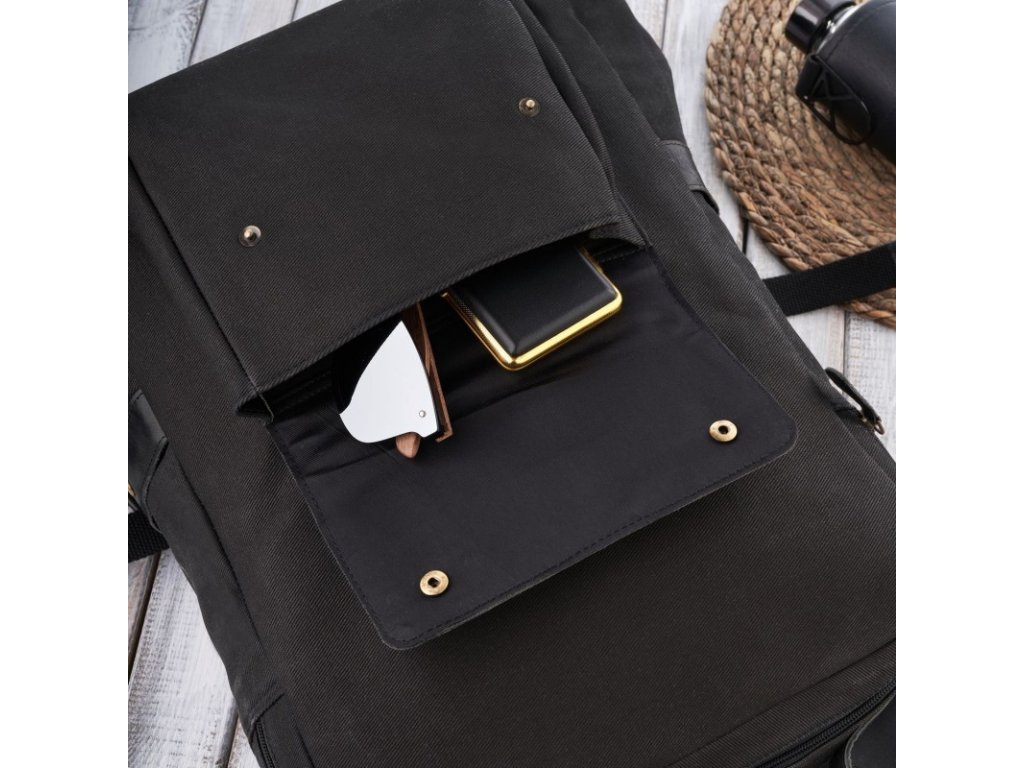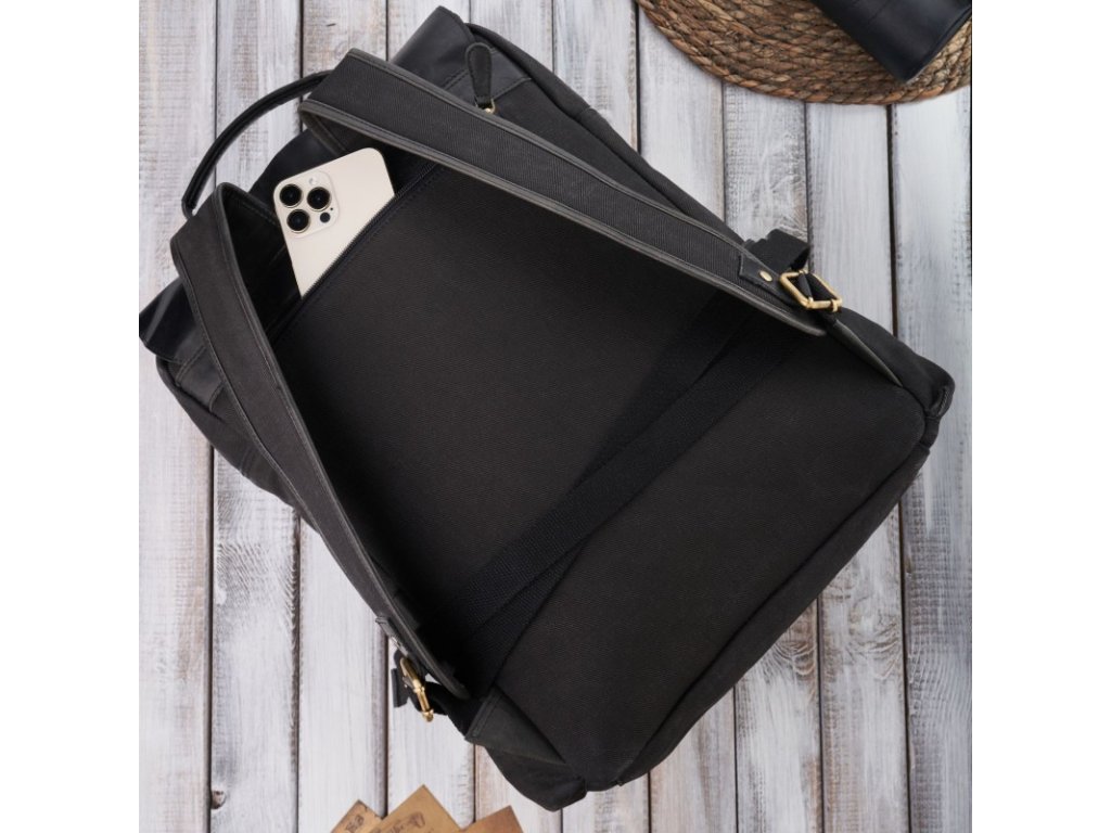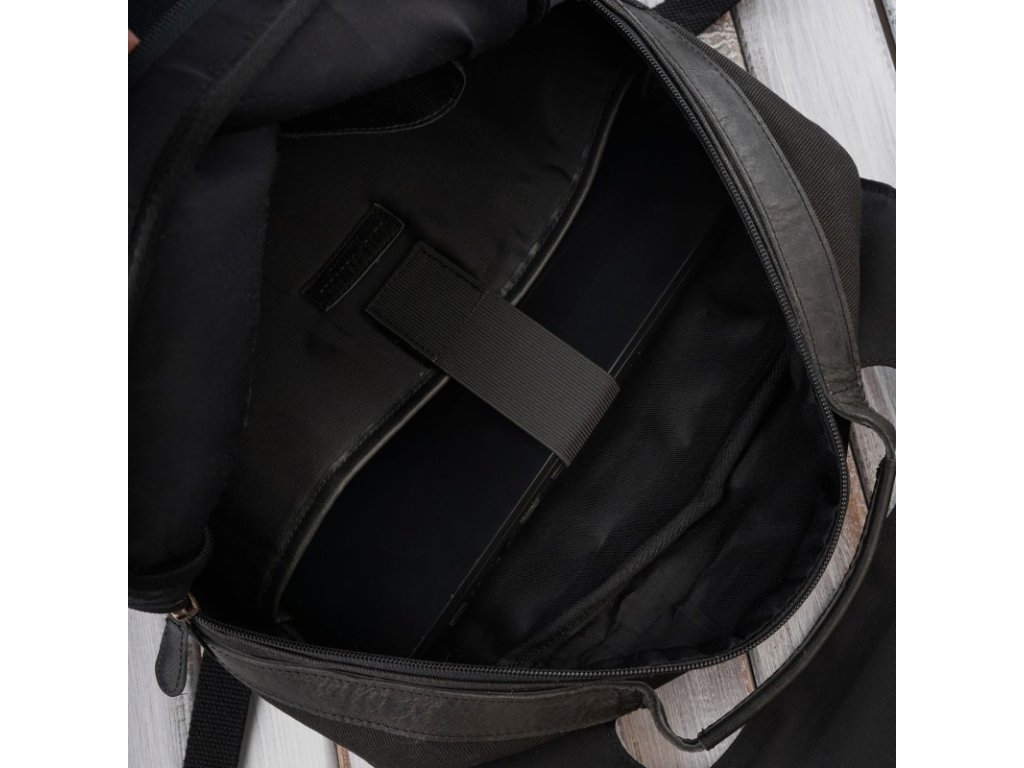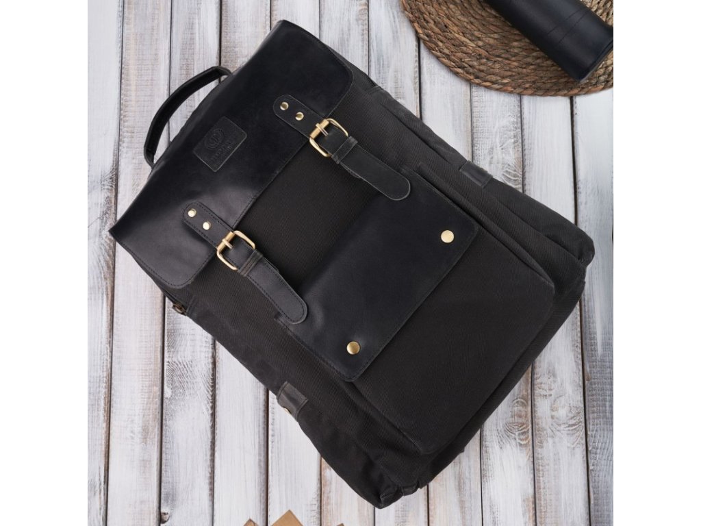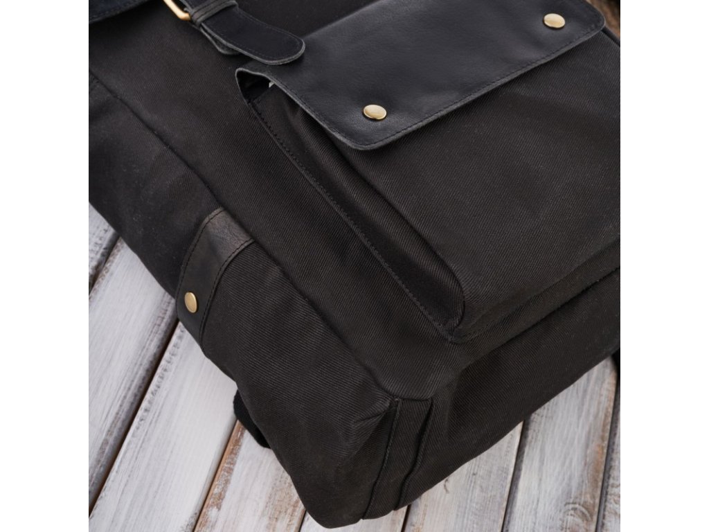 Model je vyroben z pevného, impregnované textilie a silné přírodní kůže. Pánský batoh má přední kapsu a dvě boční kapsy, všechny se zapínají na patentky. Hlavní komora je zajištěna klopou s magnety a zapínána na zip. Uvnitř jsou dvě vysunovací kapsy na telefon a přihrádka na notebook (17,3"). Další horizontální kapsa na zip se nachází v zadní části batohu. Pánský batoh má nastavitelné popruhy a madlo, zajišťující pohodlí a komfort nošení i při těžkých nákladech.