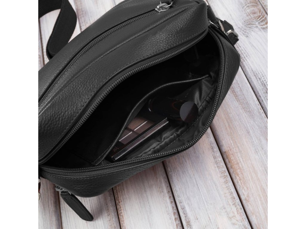 Taška má jednu hlavní přihrádku, která se zapíná na zip. Vnitřek je podšitý elegantní podšívkou a boky tašky jsou dodatečně vyztuženy pěnovou výplní. Uvnitř hlavní přihrádky se nachází široká kapsa lemovaná pravou kůží a další boční kapsa na zip. Na přední straně tašky je další nakládaná kapsa na často používané příslušenství, rovněž zapínaná na zip. Na zadní straně tašky je další kapsa na zip. Taška má pevný, široký (4 cm) ramenní popruh z bavlněné tkaniny. Navíc je taška dodávána s menším, odnímatelným koženým pouzdrem s karabinou. Oválné pouzdro je také podšité a vypolstrované pěnovou výplní. Uvnitř je popruh, na který si můžete připevnit klíče nebo jiné doplňky. Do pouzdra si můžete také uložit mince, rtěnku nebo jiné doplňky. Po odpojení lze pouzdro použít jako samostatný kožený doplněk ve formě samostatné malé peněženky-pouzdra.