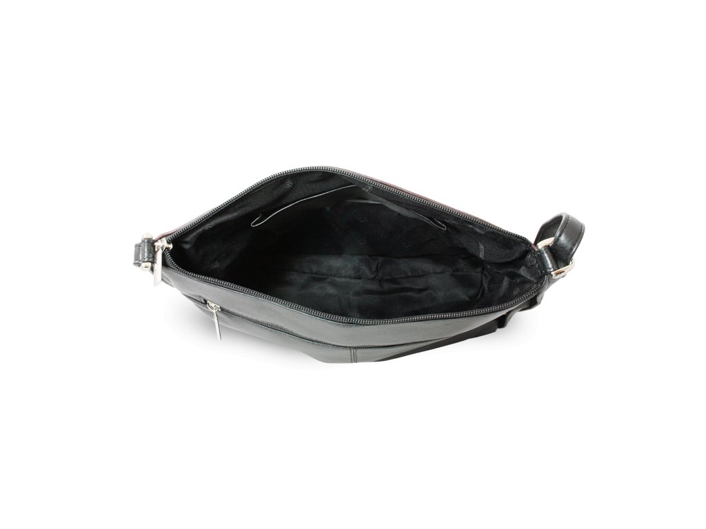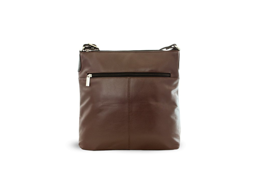 Oboustranná kabelka - přední strana tmavě hnědá, zadní strana černá barva. 1 hlavní zipová kapsa, 1 vnitřní zipová a 1 otevřená kapsička, 2 vnější zipové kapsy, zrcátko v koženém pouzdře, nastavitelný kožený popruh v max. délce 145 cm.