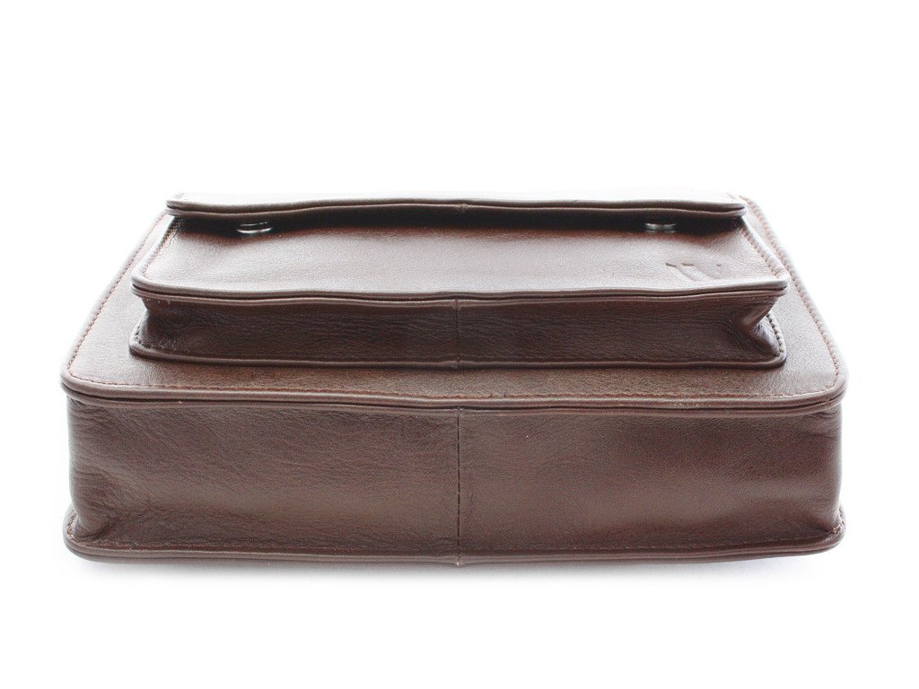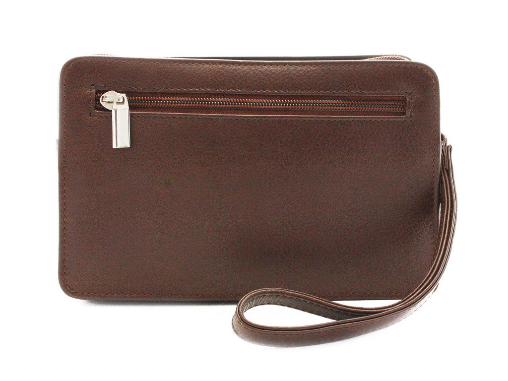Pánská kožená etue má hlavní prostor chráněný zipem. Na přední vnější straně se nachází 1 zipová a 1 klopová kapsa, na zadní vnější straně je také zipová kapsa. Součástí etue je poutko na zápěstí.