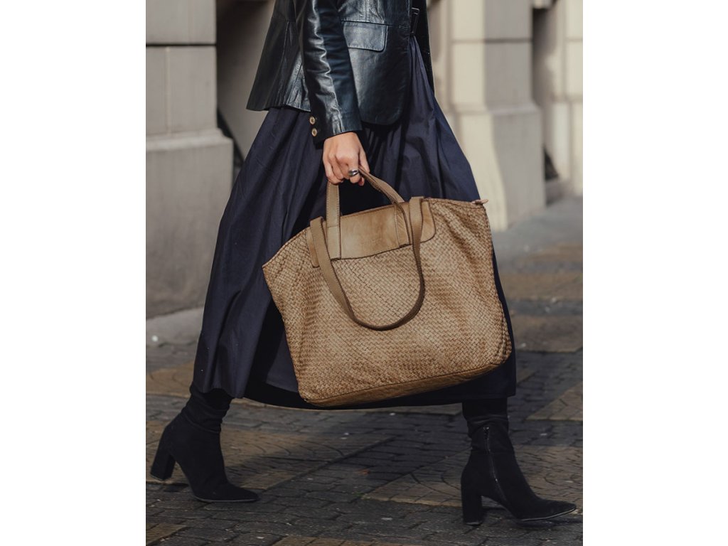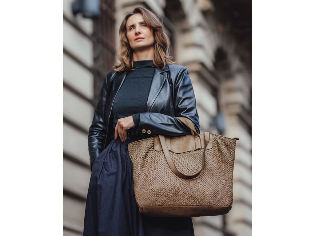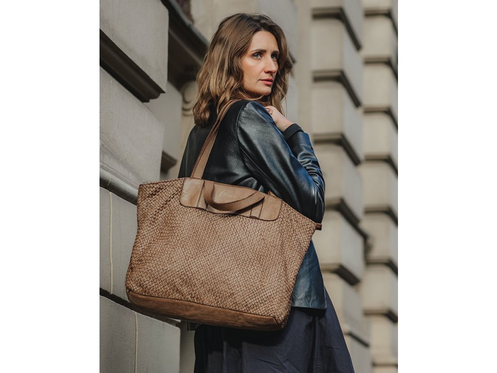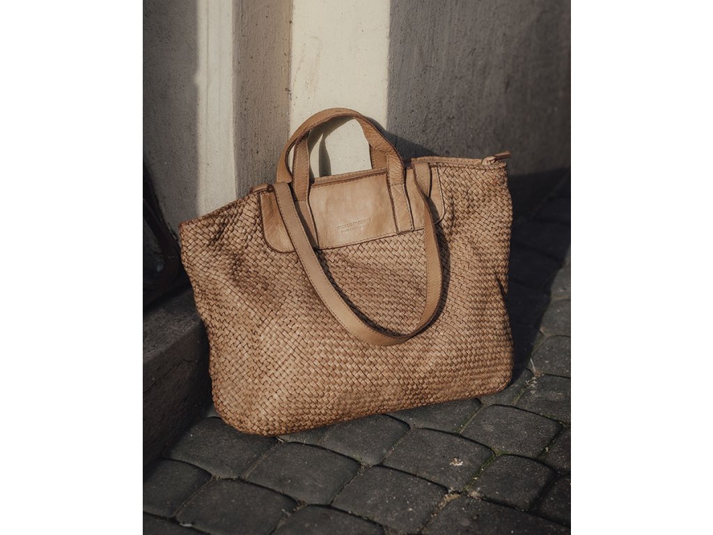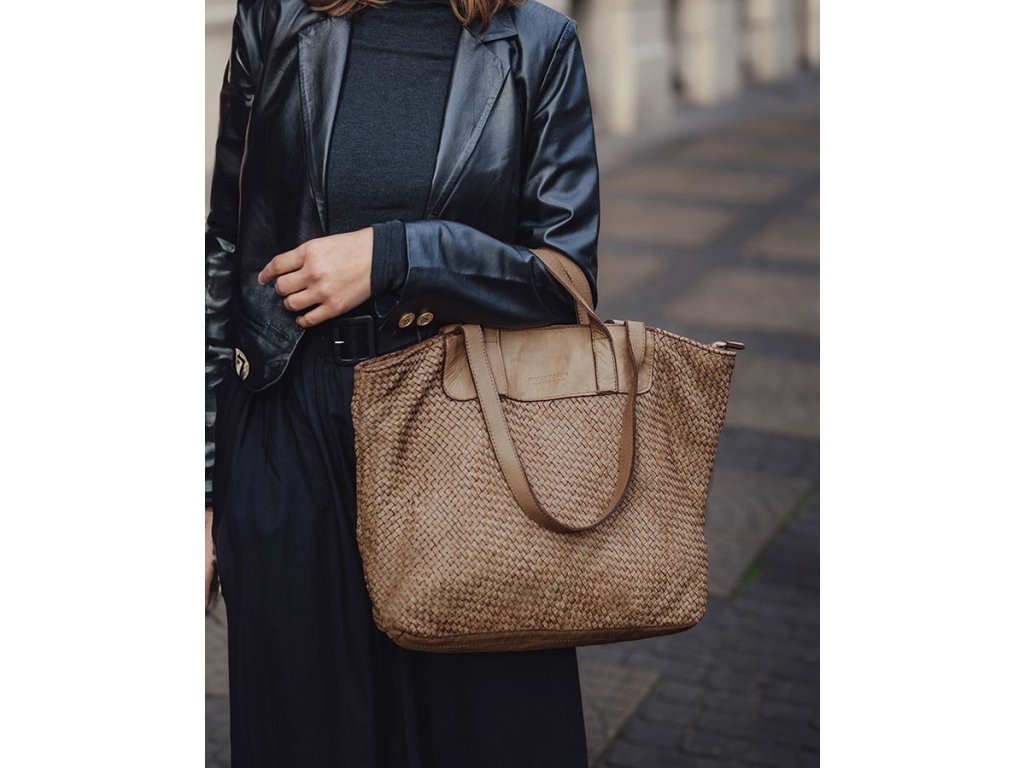 Ručně pletené kožené řemínky zdůrazňují řemeslné zpracování. Taška je určena k nošení v ruce nebo na rameni. Vnitřek je těsně uzavřen na zip. Uvnitř nabízí dvě větší přihrádky a kapsu na zip. Celek je pečlivě zakončen podšívkou.