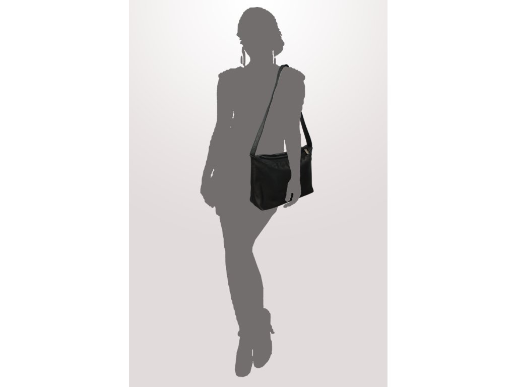 2 zipové separace, vnitřní zipová kapsa, kapsa na mobil, odepínatelný kroužek na klíče a malé zrcátko v koženém obalu, venkovní dlouhá kapsa pro skládací deštník. Délka popruhu 80 cm.