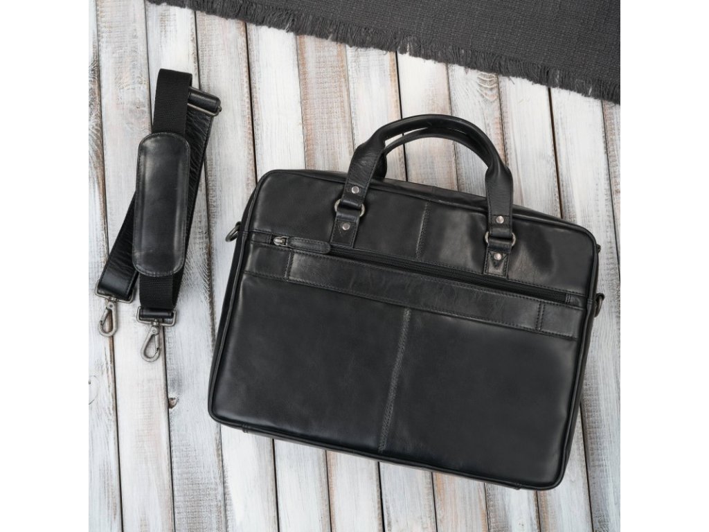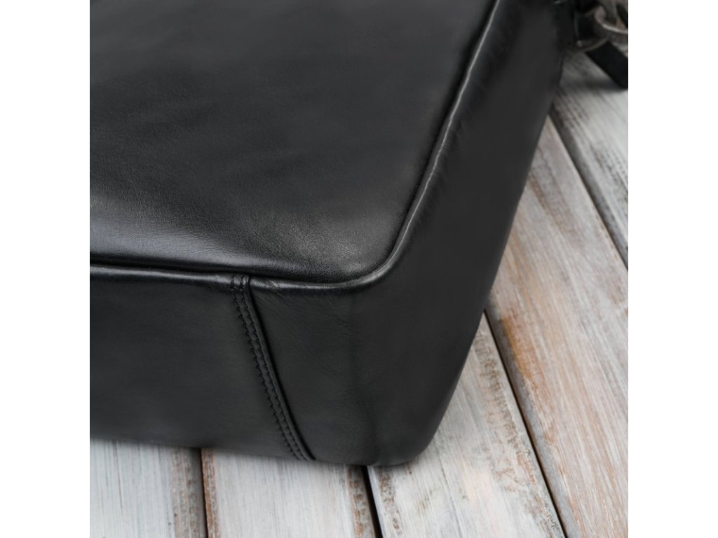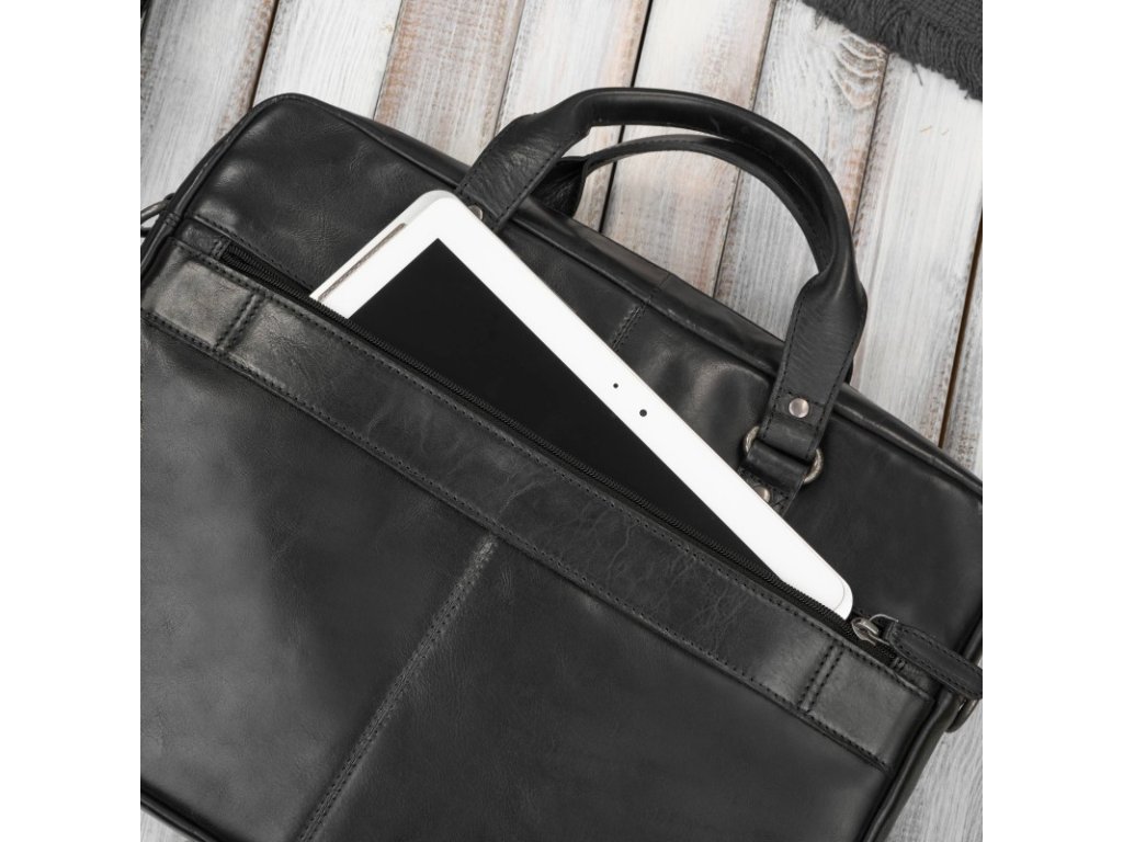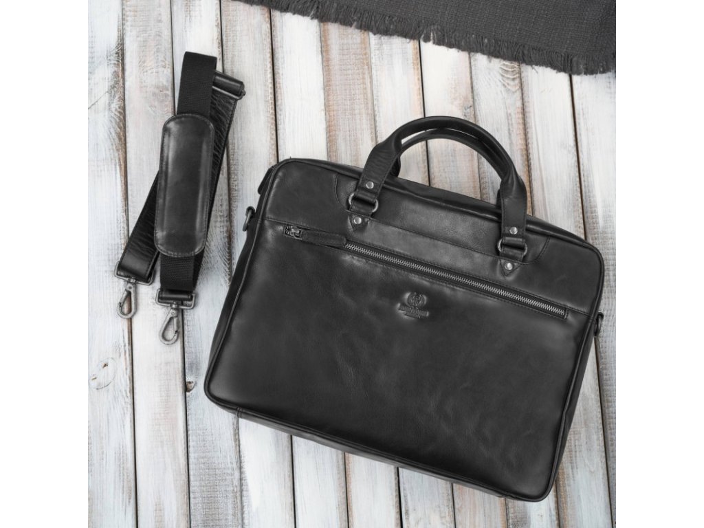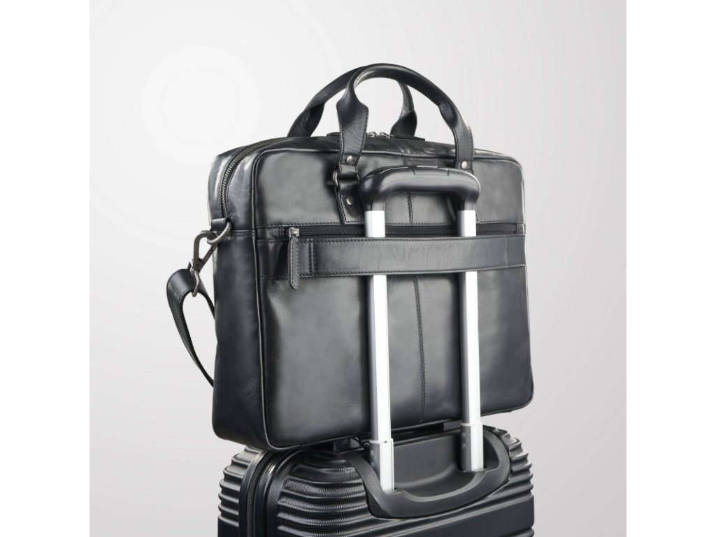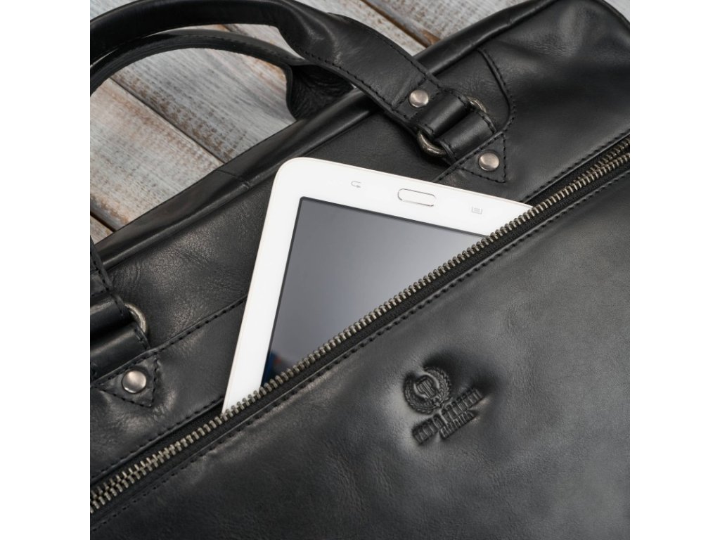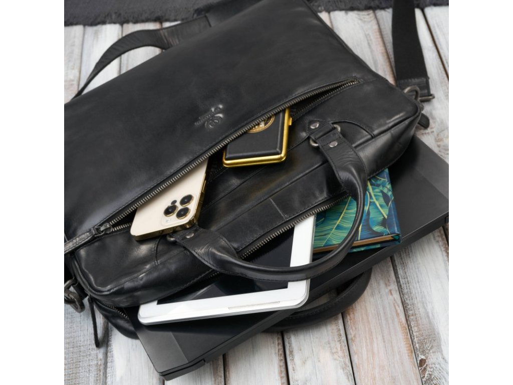 Je vyrobena z vysoce kvalitní pravé kůže a zaujme svým elegantním, tmavě černým povrchem, který zdůrazňuje profesionální charakter brašny. Matně stříbrné kování dodává brašně jemný vintage nádech a vytváří nadčasový design vhodný jak pro pracovní, tak pro každodenní nošení. Brašna je navržena pro intenzivní používání, je vysoce odolná vůči skvrnám a interiér s logem značky svědčí o pečlivé pozornosti k detailu. Uvnitř je přihrádka na notebook s distanční pěnou, která chrání vaše zařízení před nárazy a poškrábáním. Kožené poutko na opasek na zadní straně brašny umožňuje protáhnout brašnu teleskopickou rukojetí kufru. Toto je ideální řešení pro cestovatele – umožňuje vám pohodlně kombinovat svá zavazadla a sestavit je do jednoho stabilního celku, čímž se odlehčí vaše ramena a zvýší se pohodlí při pohybu. Dlouhý, nastavitelný popruh (80-135 cm), který je plně odnímatelný, umožňuje dvě možnosti nošení: v ruce jako klasická aktovka nebo na rameni jako elegantní obchodní taška.