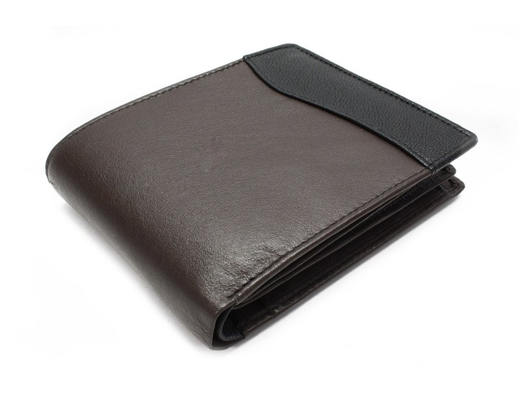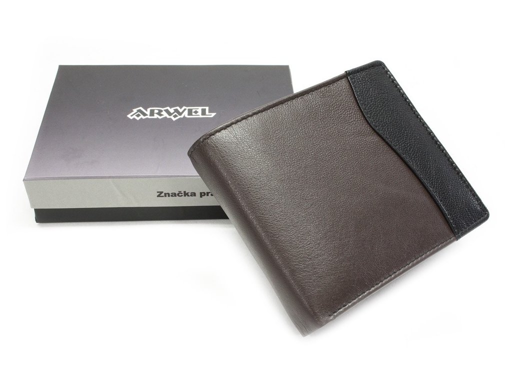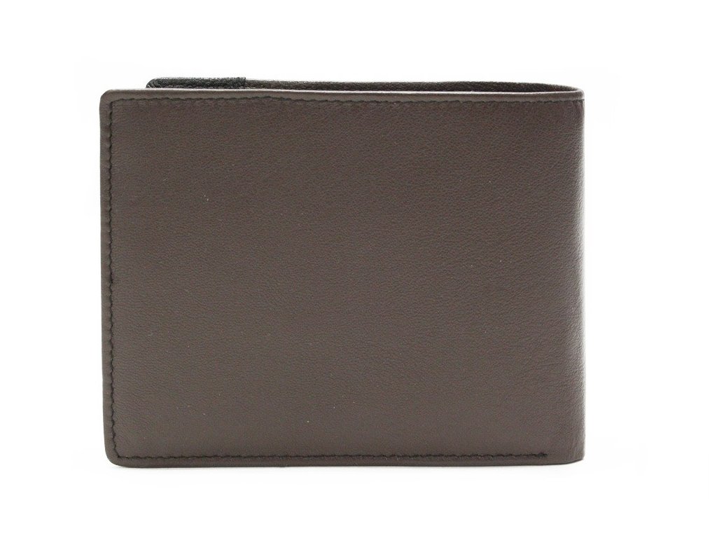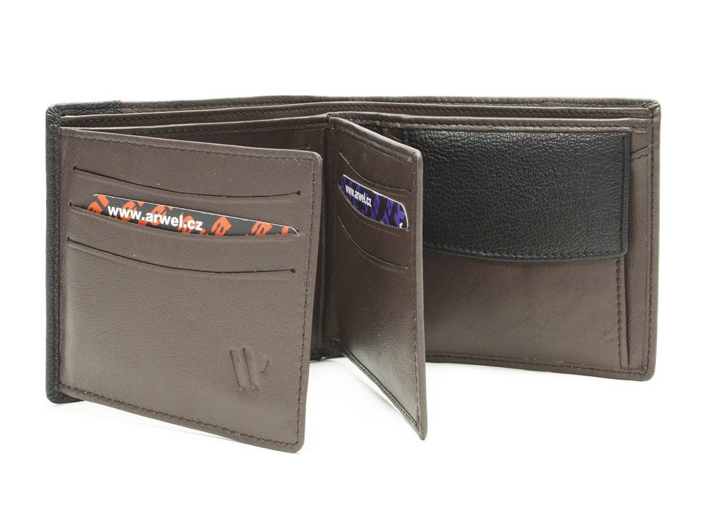 2 přihrádky na bankovky, kapsa na mince, 12 kapes na kreditní karty, 1 průhledná a 4 skryté boční kapsy.Barva kůže - hnědá, černá