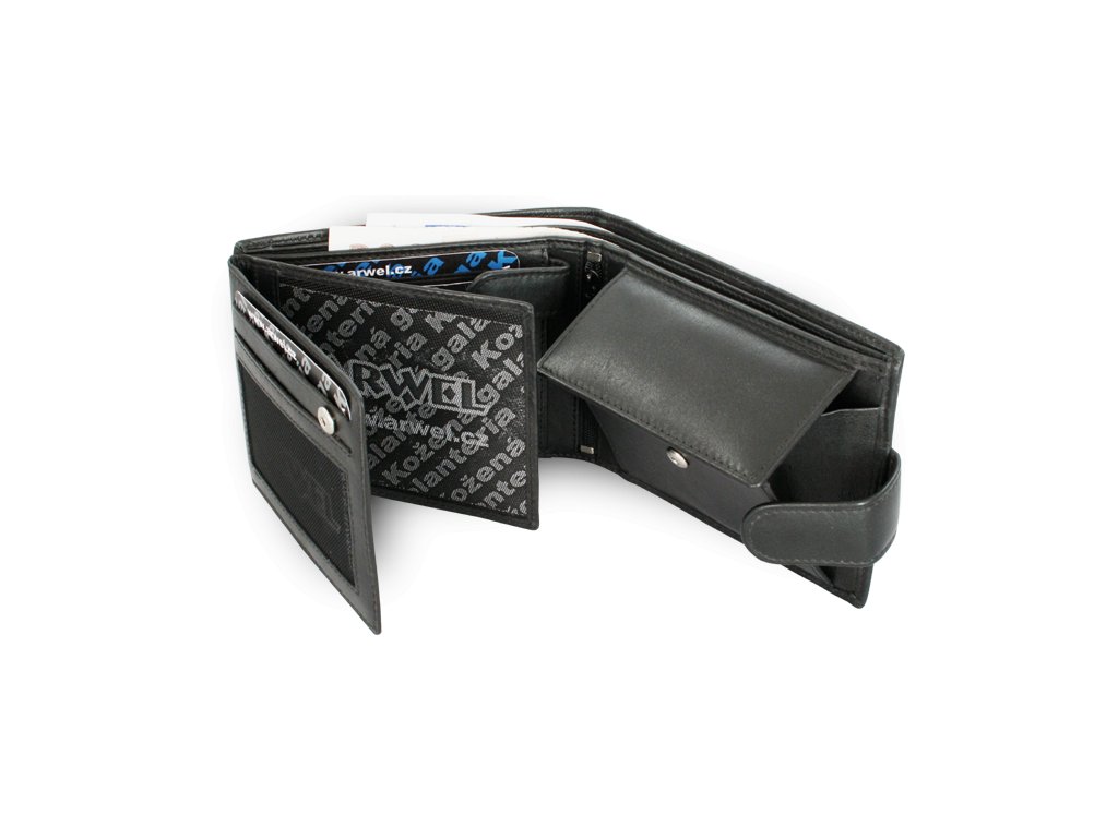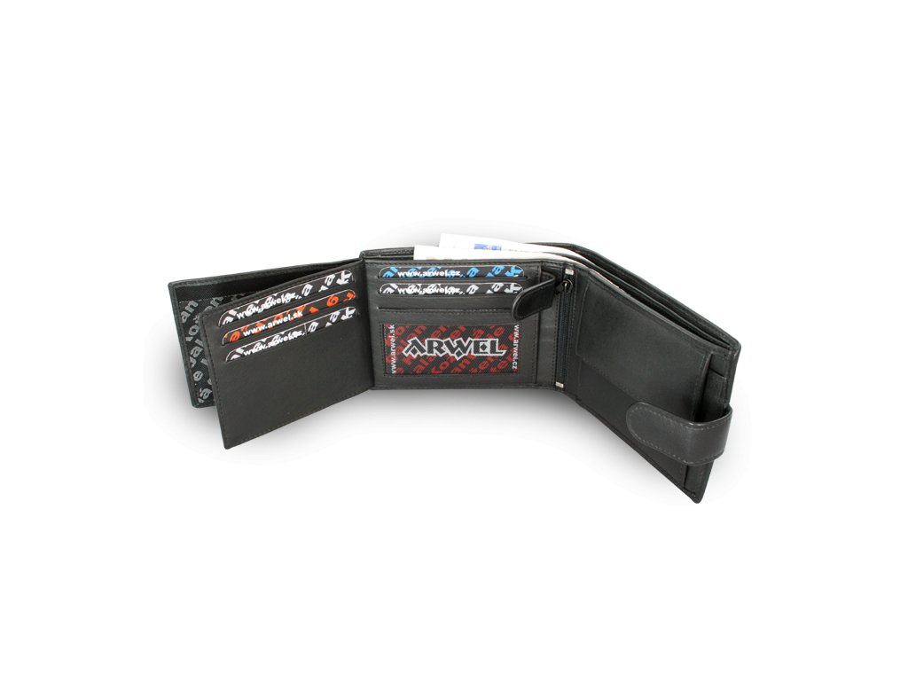 2 přihrádky na bankovky, 1 kapsa na mince, 7 kapes na kreditní karty, 4 průhledné, 2 boční a 1 vnitřní zipová kapsa, kapsy velikosti osobních dokladů.