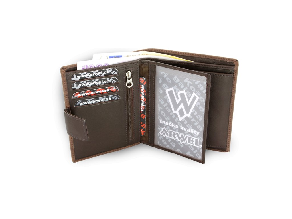 2 přihrádky na bankovky, klopnová kapsa na mince, 13 kapes na kreditní karty, občanský nebo řidičský průkaz, malá vnitřní zipová kapsa, velká průhledná kapsa, dodáváme v dárkové krabičce.