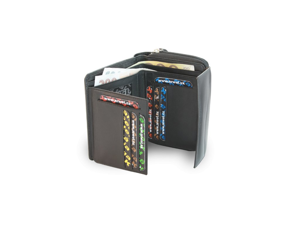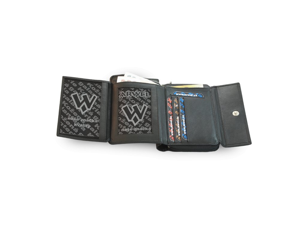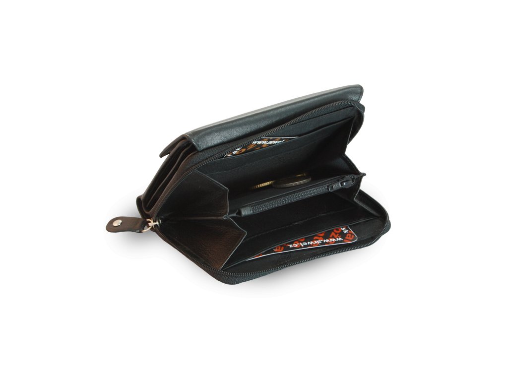 Pod klopnou po rozevření 2 přihrádky na bankovky, 8 kapes na kreditní karty, 1 skrytá a dvě průhledné kapsy, pod zipem umístěným po obvodu zdvojená zipová kapsa na mince s 2 všitými a jednou zipovou kapsičkou.
