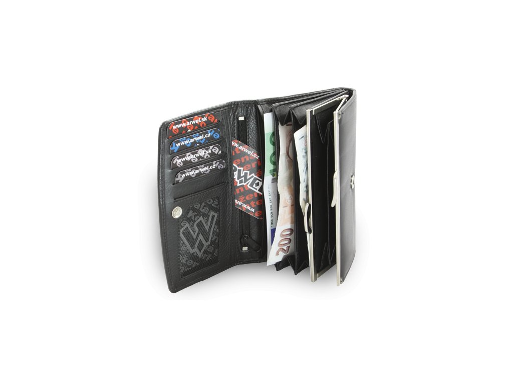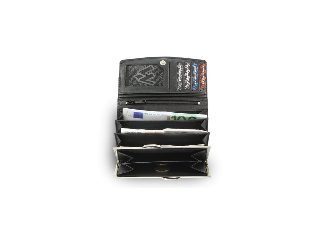 3 přihrádky na bankovky a vnitřní rámová kapsa na mince, 4 kapsy na kreditní karty, 1 průhledná kapsa, 1 zipová, 3 vnitřní a 1 venkovní kapsa.