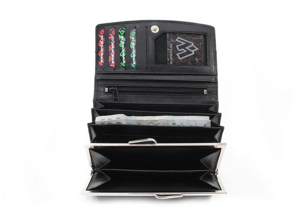 3 přihrádky na bankovky a vnitřní rámová kapsa na mince, 4 kapsy na kreditní karty, 1 průhledná kapsa, 1 zipová, 3 vnitřní a 1 venkovní kapsa.