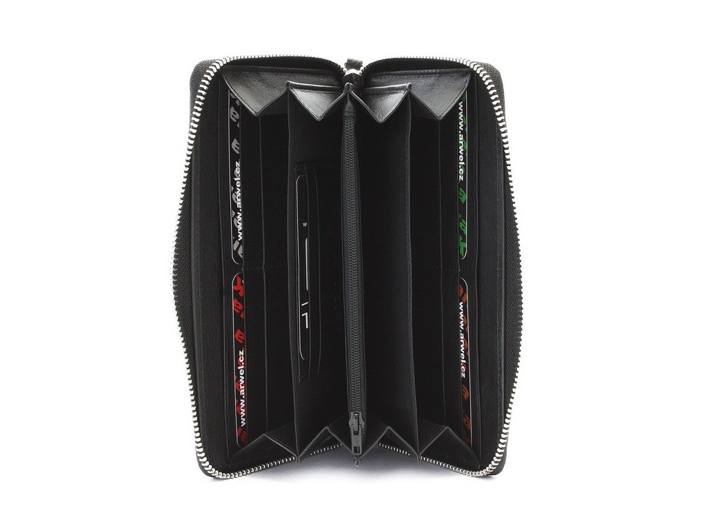 Atraktivní dámská velká peněženka obsahuje 2 přihrádky na bankovky a další 2 otevřené přihrádky, vnitřní zipovou kapsu na mince, 14 kapes na platební karty či doklady. Na zadní vnější straně je zipová kapsa. Peněženka má zapínání na kovový zip.