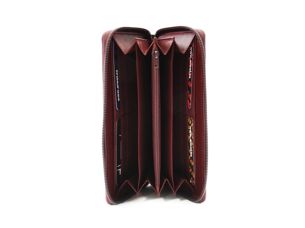 2 přihrádky na bankovky a další 2 přihrádky, do kterých lze vložit mobilní telefon, vnitřní zipová kapsa na mince, 10 kapes na platební karty.