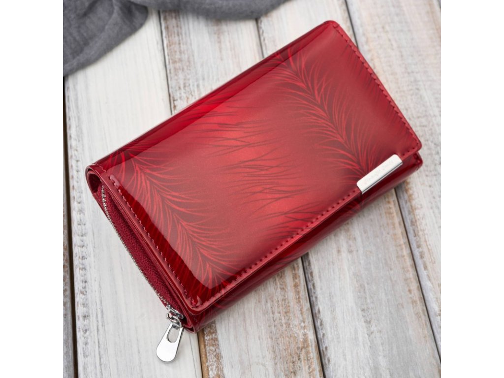 Elegantní dámská kožená peněženka určená pro ženy, které si cení vytříbeného stylu a promyšlené funkčnosti. Vyrobena z vysoce kvalitní lakované kůže, přitahuje pozornost svou tmavě sytou červenou barvou a decentním rostlinným motivem, viditelným pod lesklým povrchem laku.