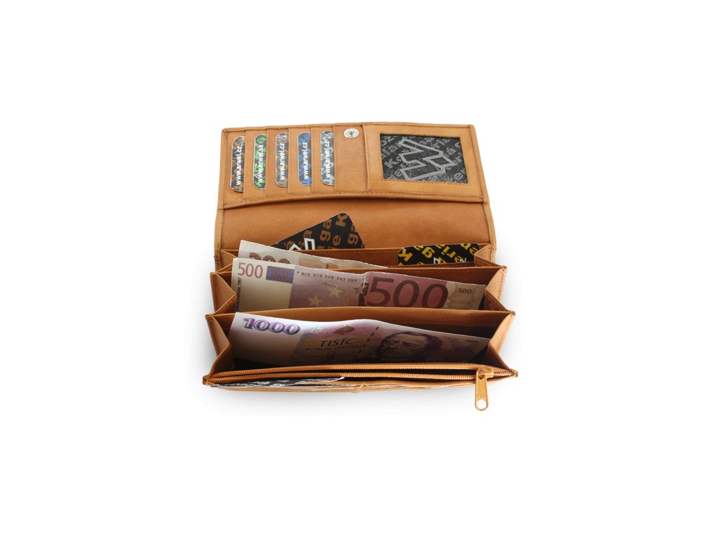 3 přihrádky na bankovky + 1 zipová kapsa na mince, 6 kapes na kreditní karty, 3 vnitřní kapsy, 1 zipová a 1 otevřená zadní kapsa.