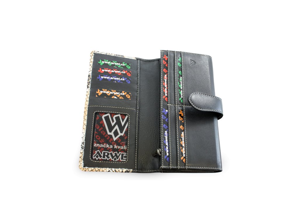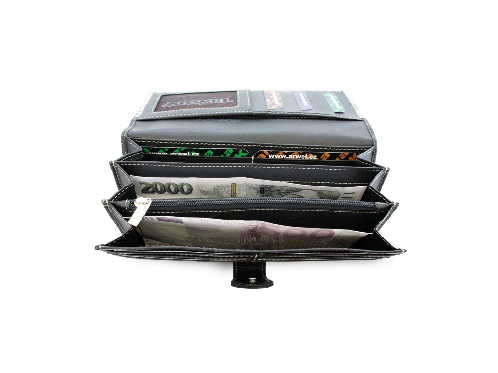 2 přihrádky na bankovky + 1 zipová kapsa na mince, 17 kapes na kreditní karty, 1 průhledné kapsa, 2 vnitřní kapsy, 1 otevřená zadní kapsa. Světlé šití.