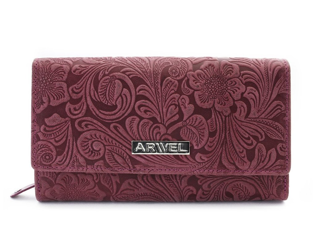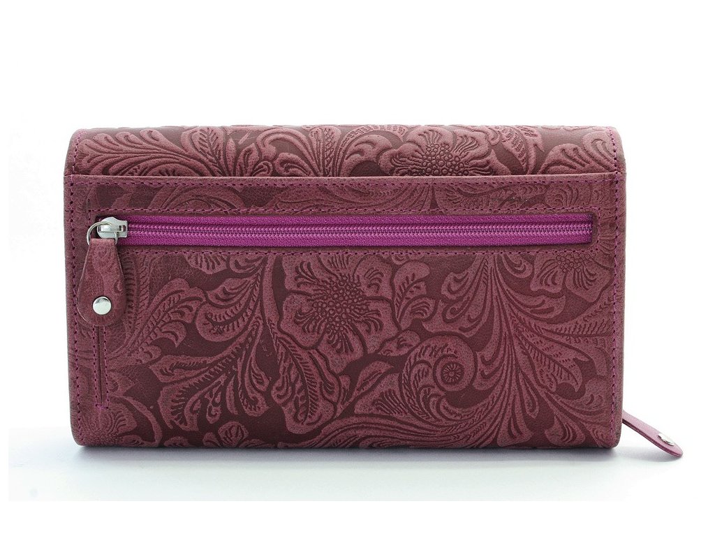 Atraktivní dámská velká peněženka obsahuje 2 přihrádky na bankovky, vnitřní rozdělenou zipovou kapsu na mince, 12 kapes na platební karty či doklady, 5 otevřených kapes a 3 průhledné okna. Na zadní vnější straně je zipová kapsa. Peněženka má zapínání na klopnu s ozdobným kováním jištěnou drukem. Šití je v barvě kůže.