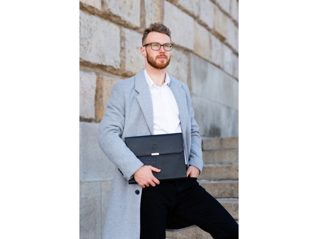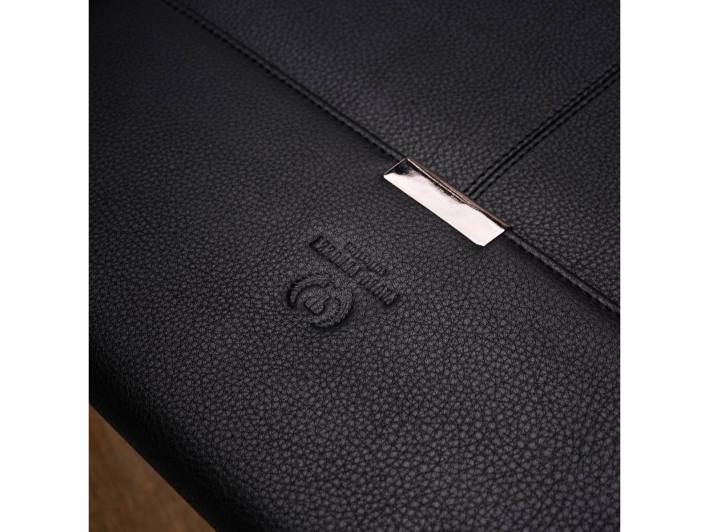 Taška je vyrobena z pravé kůže s logem výrobce na přední straně. Zapíná se na patentní knoflík a má výklopný, prostorný interiér. Uvnitř je zasouvací kapsa na dokumenty A4, výklopná přepážka, kapsa na zip, 7 kapes na vizitky a jedna průhledná přihrádka. Navíc má taška poutko na pero.
