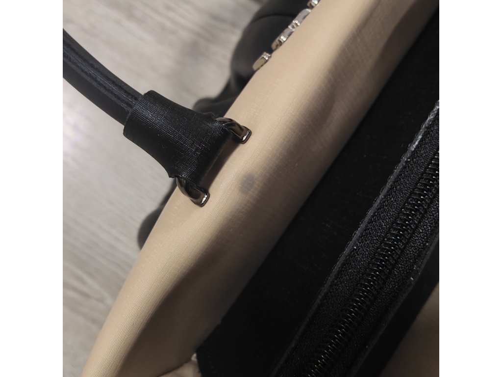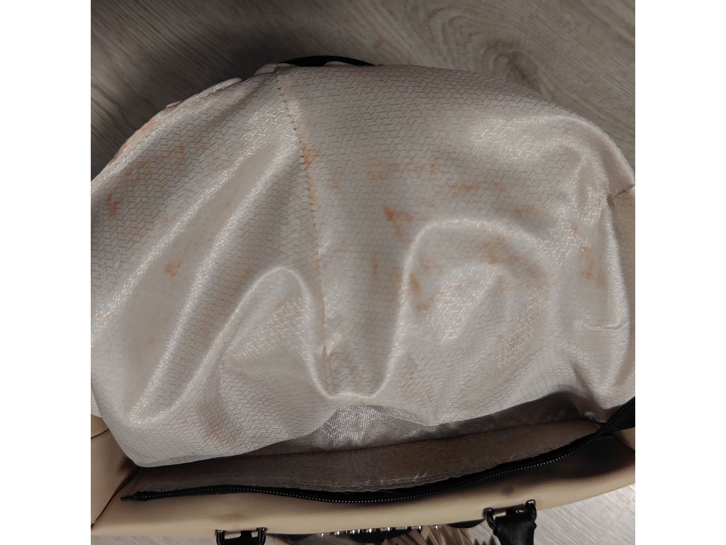 Kabelka má jednu malou skvrnu o velikosti cca 4 mm na každé straně uší. Podšívka zbarvena od papírové výstuže. Viz foto. Jinak bez vad. Zboží nelze vrátit.