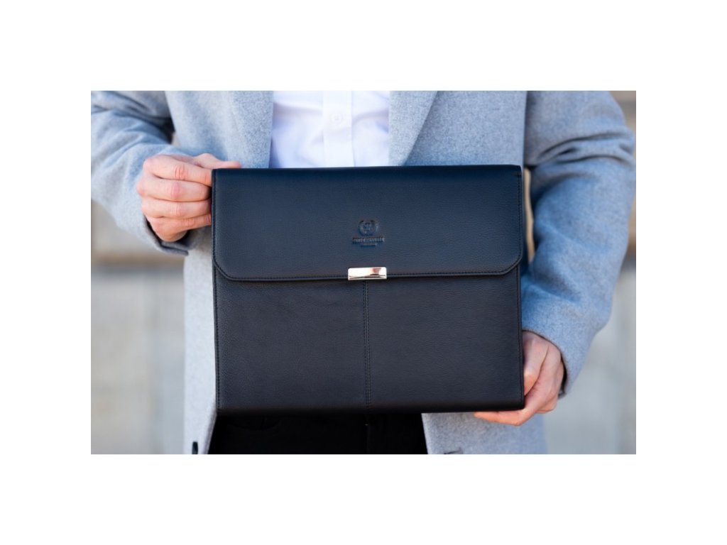 Taška je vyrobena z pravé kůže s logem výrobce na přední straně. Zapíná se na patentní knoflík a má výklopný, prostorný interiér. Uvnitř je zasouvací kapsa na dokumenty A4, výklopná přepážka, kapsa na zip, 7 kapes na vizitky a jedna průhledná přihrádka. Navíc má taška poutko na pero.